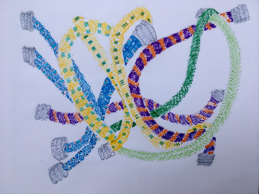 Day 301 Barbara Griffin Uncategorized March 17, 2020 1 Minute Bungee straps. Share this: Share on X (Opens in new window) X Share on Facebook (Opens in new window) Facebook Like Loading... Published by Barbara Griffin Exploring connections between people working in different disciplines in weaving, poetry and music. View all posts by Barbara Griffin Published March 17, 2020