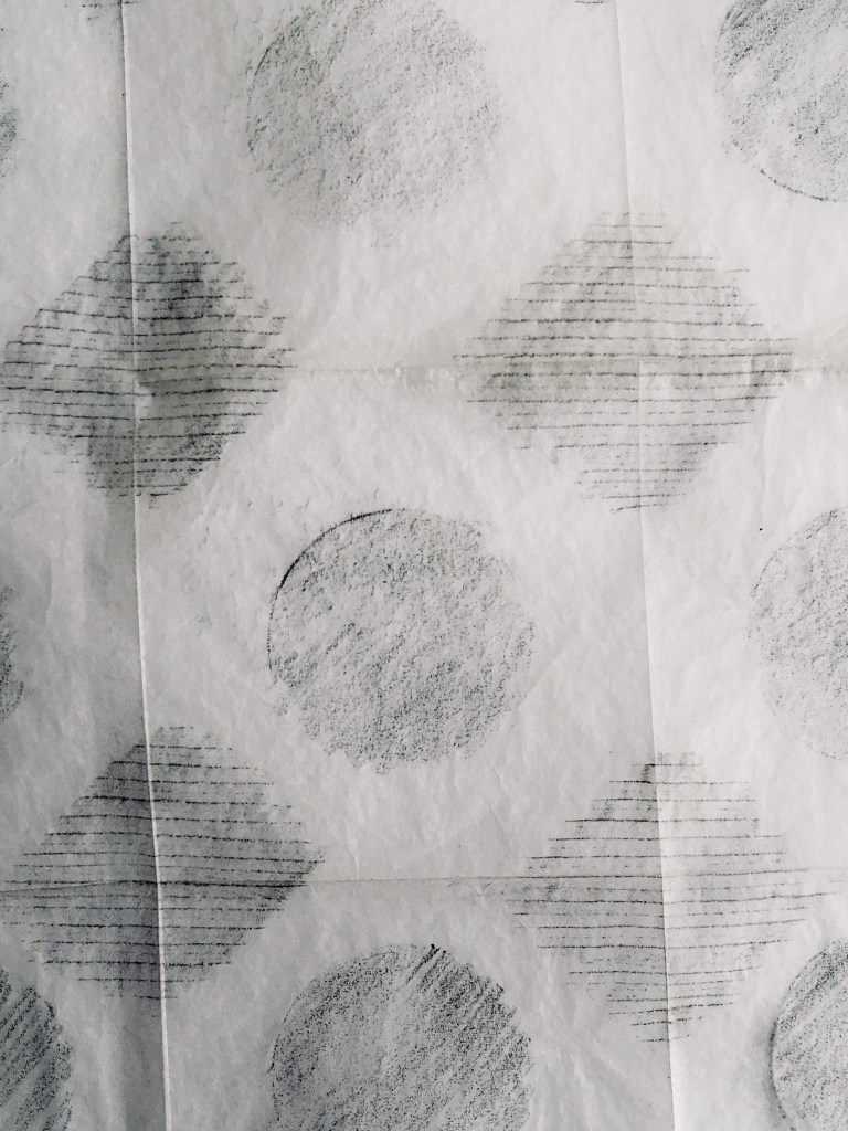 Aim to create a pattern using Frottage and folded paper. WIP from ‘Grammar of ornament’ Owen Jones in Gombrich 1977:53. Frottage using graphite of dried leek skin and a dot. Grid created by folding tissue paper.