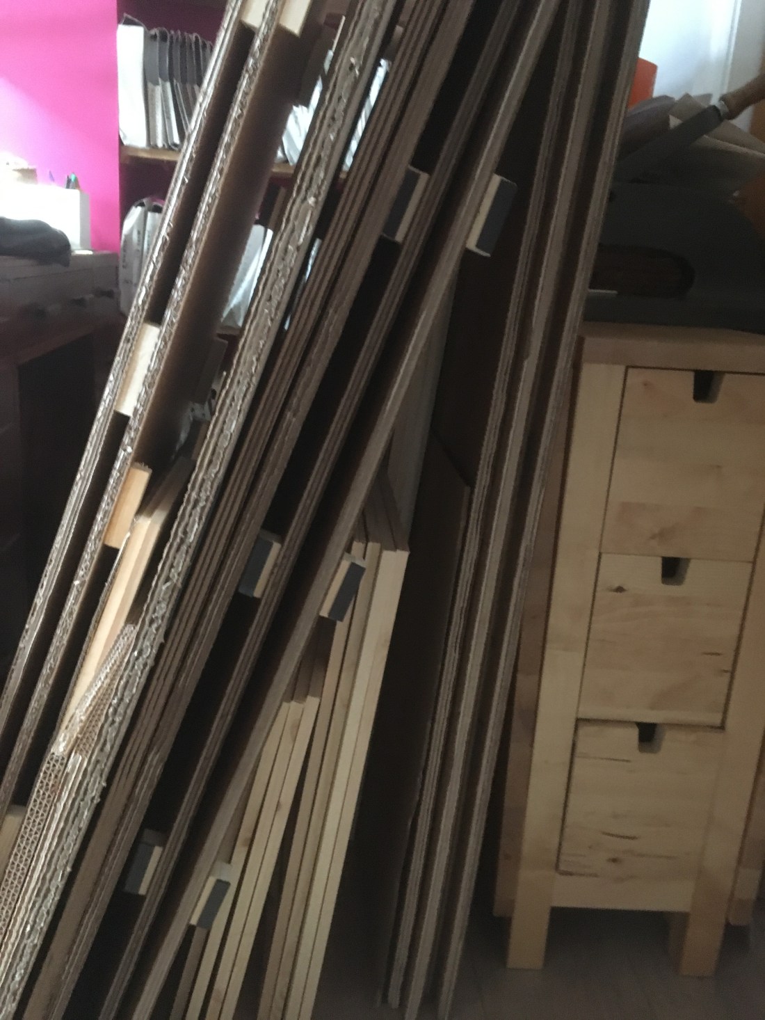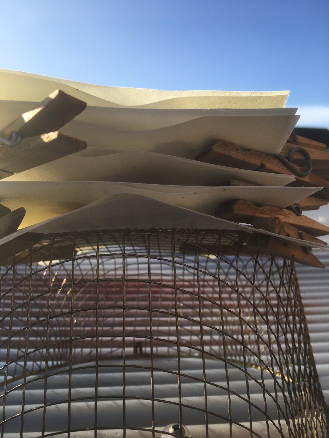 Construction of wire chip maker, alum soaked paper, cosmos flowers in between paper and pegs.